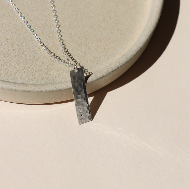 The Mama Bar Necklace is a meaningful piece designed to be worn close every day. Featuring a softly hammered bar engraved with “mama,” it reflects light with subtle texture while adding a personal, heartfelt touch.