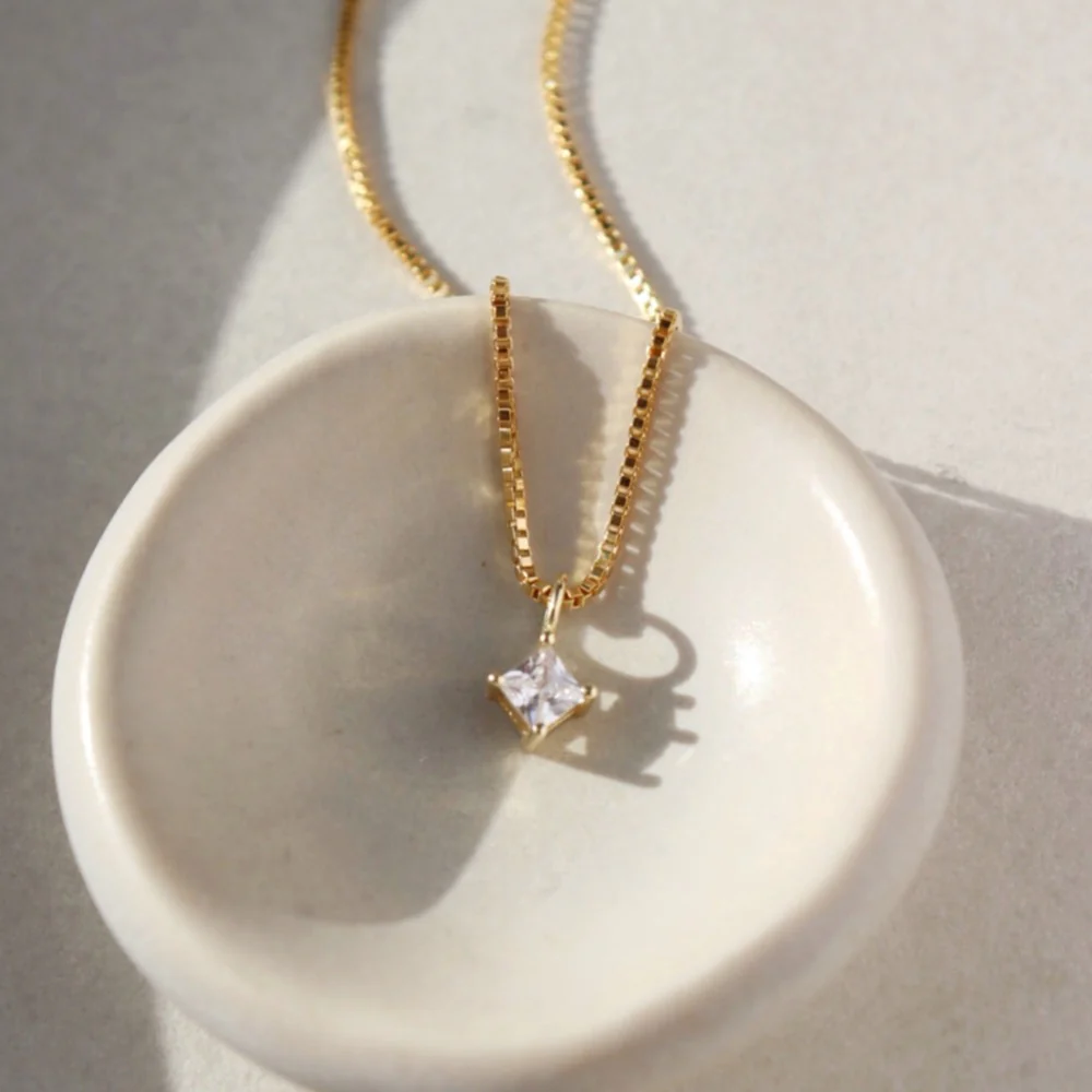 Our Quinn Necklace is a classic accessory that's the perfect finishing touch of sparkle to any look. Our sleek gold chain is embellished with a sparkly, square-cut cubic zirconia that's beautifully set in 14k gold fill.