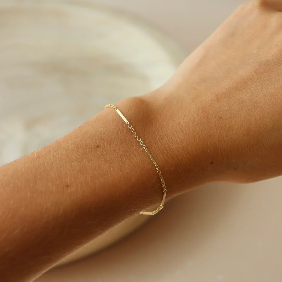 Our Sailor Bracelet is one of our fan favorites! As a best selling chain, the Sailor Bracelet is known for its perfectly dainty bar and link chain. The understated elegance of this bracelet leaves your stacking options endless!