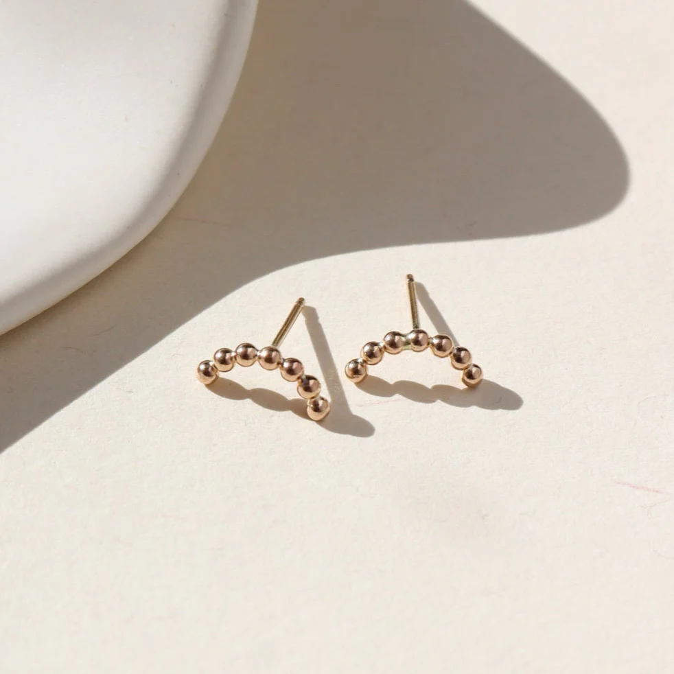 Our Sequin Arcs are a minimal stud earrings feature a chic arc shape, perfect for making subtle yet stylish statements. Looking to create a stack? Our Spiral Hoops would make a duo with these!